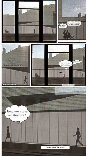Fotocompilatie van "Lady in Manolo's", een 3D stripverhaal in 4 scenes