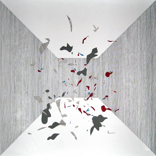 pentekening en papierknipsels in multiplex vitrinebak 120 x 120cm